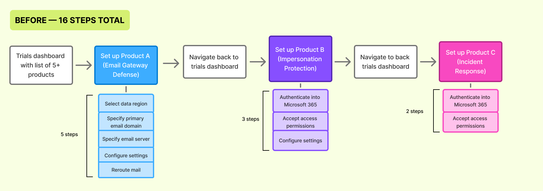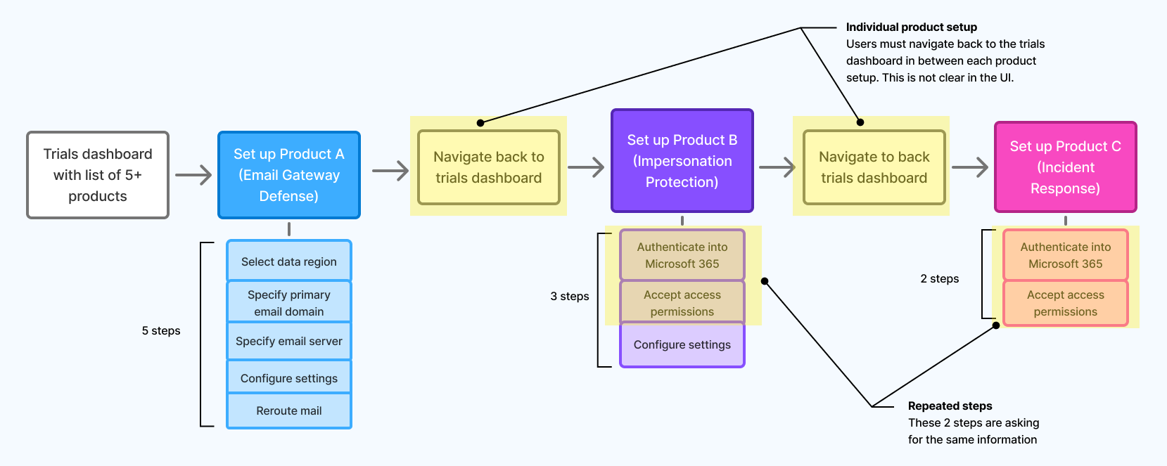User flow for the original setup experience. Users must navigate back to the trials products to continue setting up the next product(s), and there is no clear direction as part of the flow.