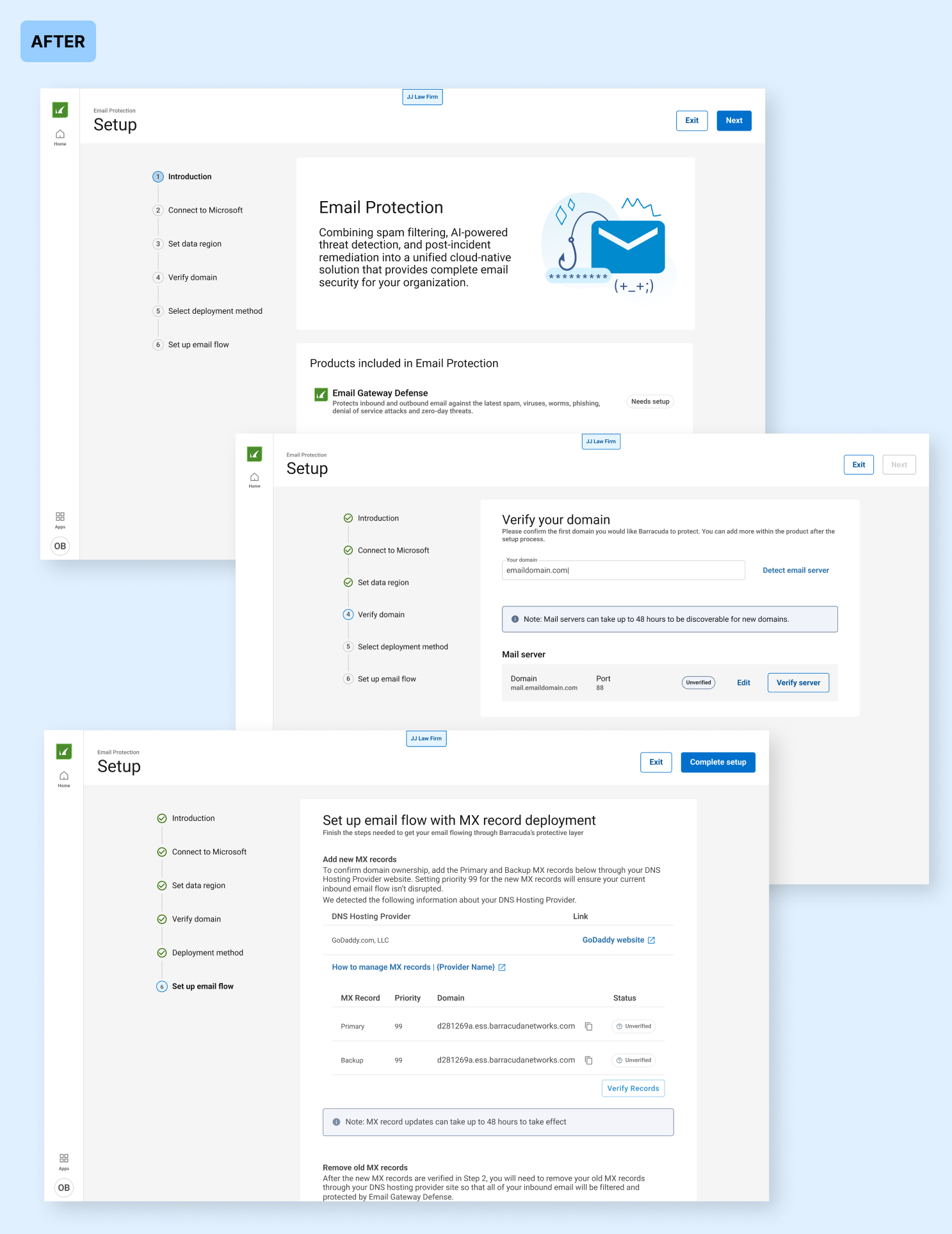 I led an initiative within the UX team to come up with a common setup layout, which can be used as a repeatable template across Barracuda products. This creates a consistent setup experience across the product portfolio and improves design-to-development efficiency for future projects.
