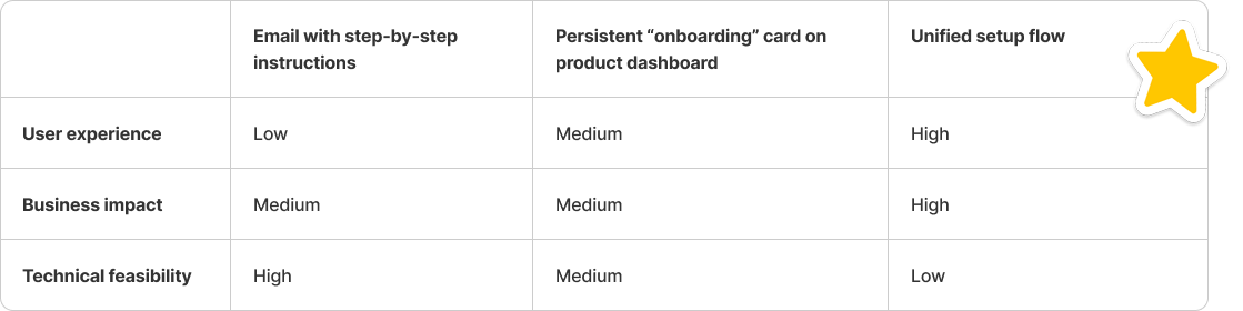 Design, engineering, and product management ranked the ideas based on usability, business impact, and technical feasibility. With this information, we decided on unified setup flow.